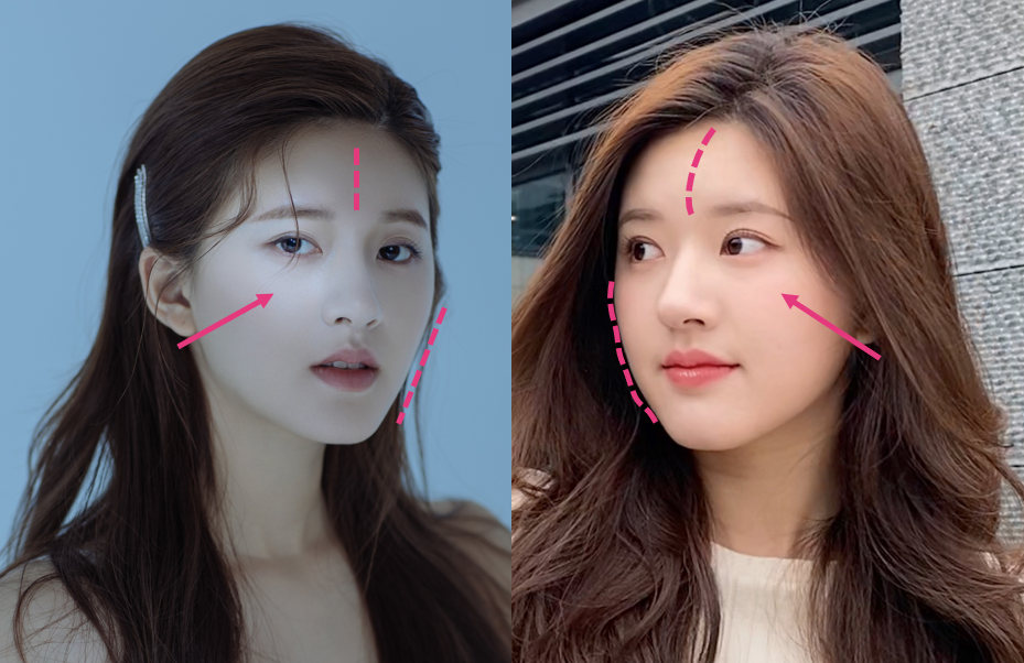 左边因为灯光修图把额头、脸颊、眼下三角区抹平了,有没有感觉就清冷了很多?