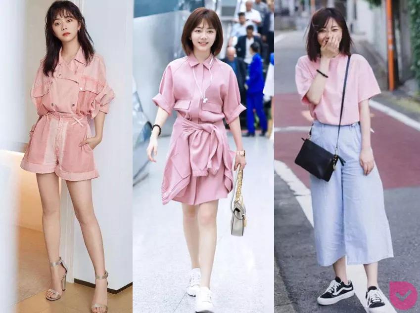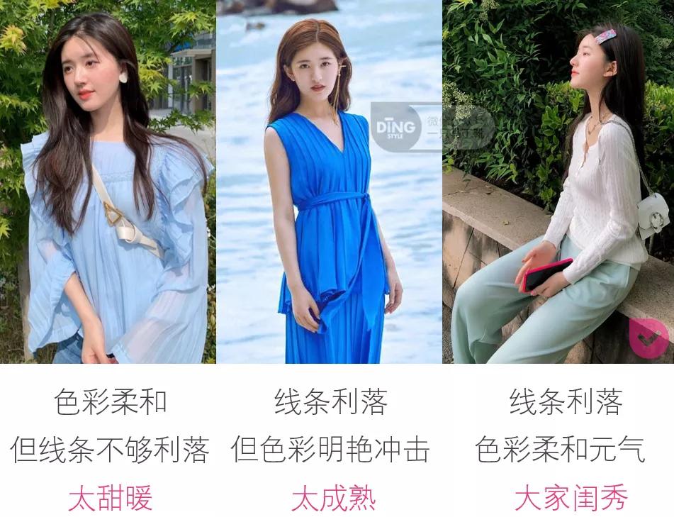 左边两套为了平衡粉色的甜腻,加了很多工装元素,就有点太复杂了,不适合营造盐系气质。