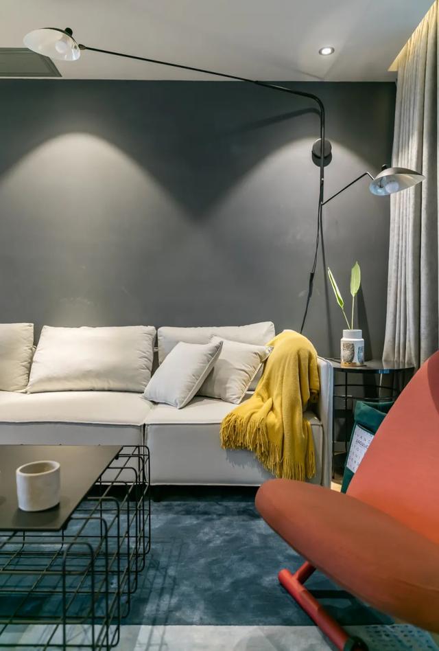 ▲沙发边上的长杆壁灯,结合旁边的茶几与花瓶布置,一张鲜红的休息沙发椅,也使得客厅氛围更加简约自然而惬意。