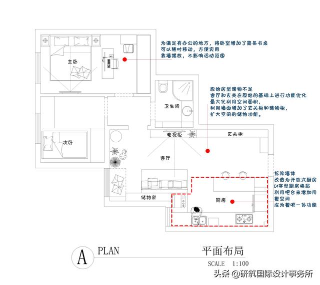 1.打掉原厨房墙体做开放式厨房,增加吧台增加用餐空间,成为餐吧一体化功能。